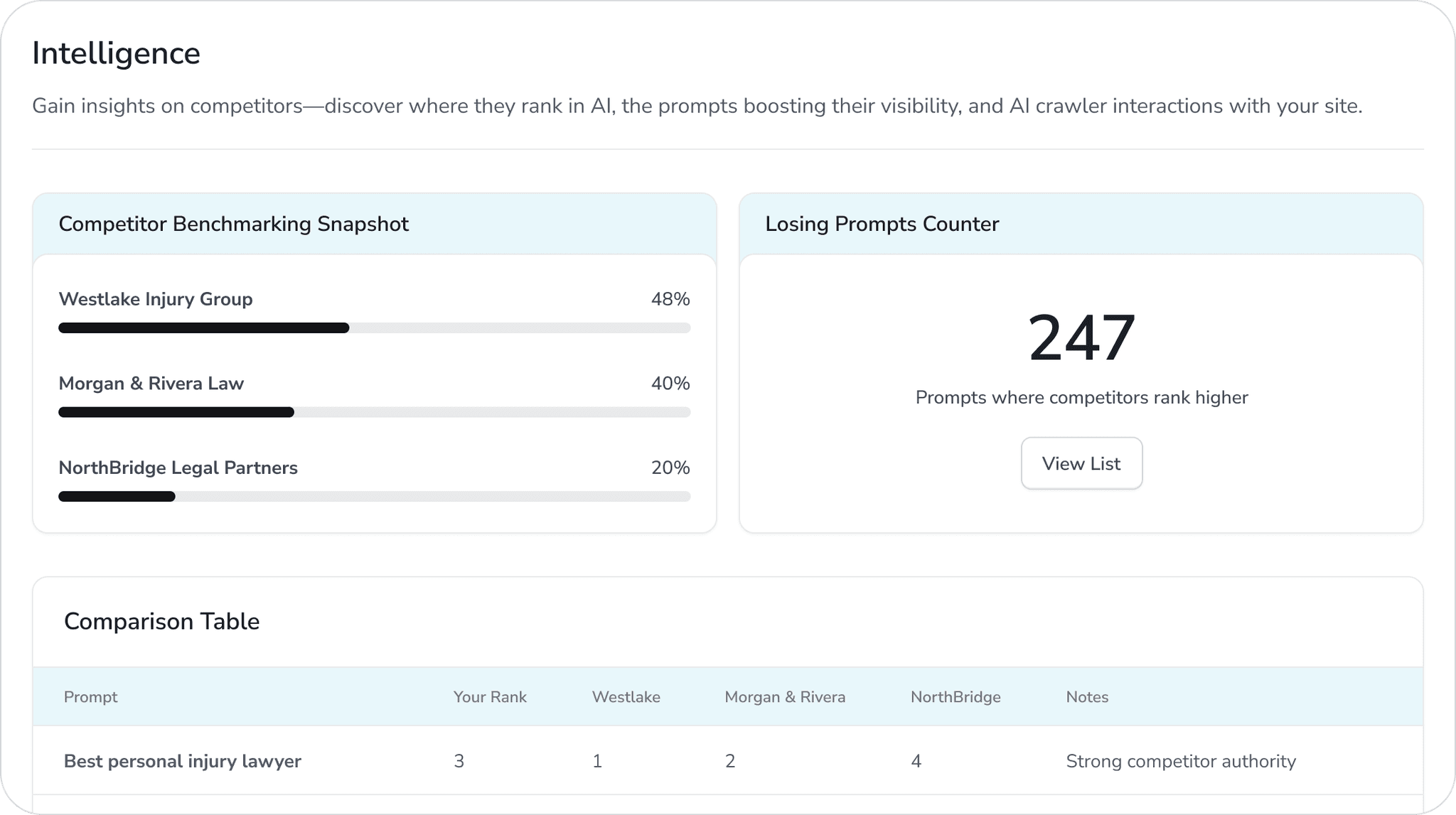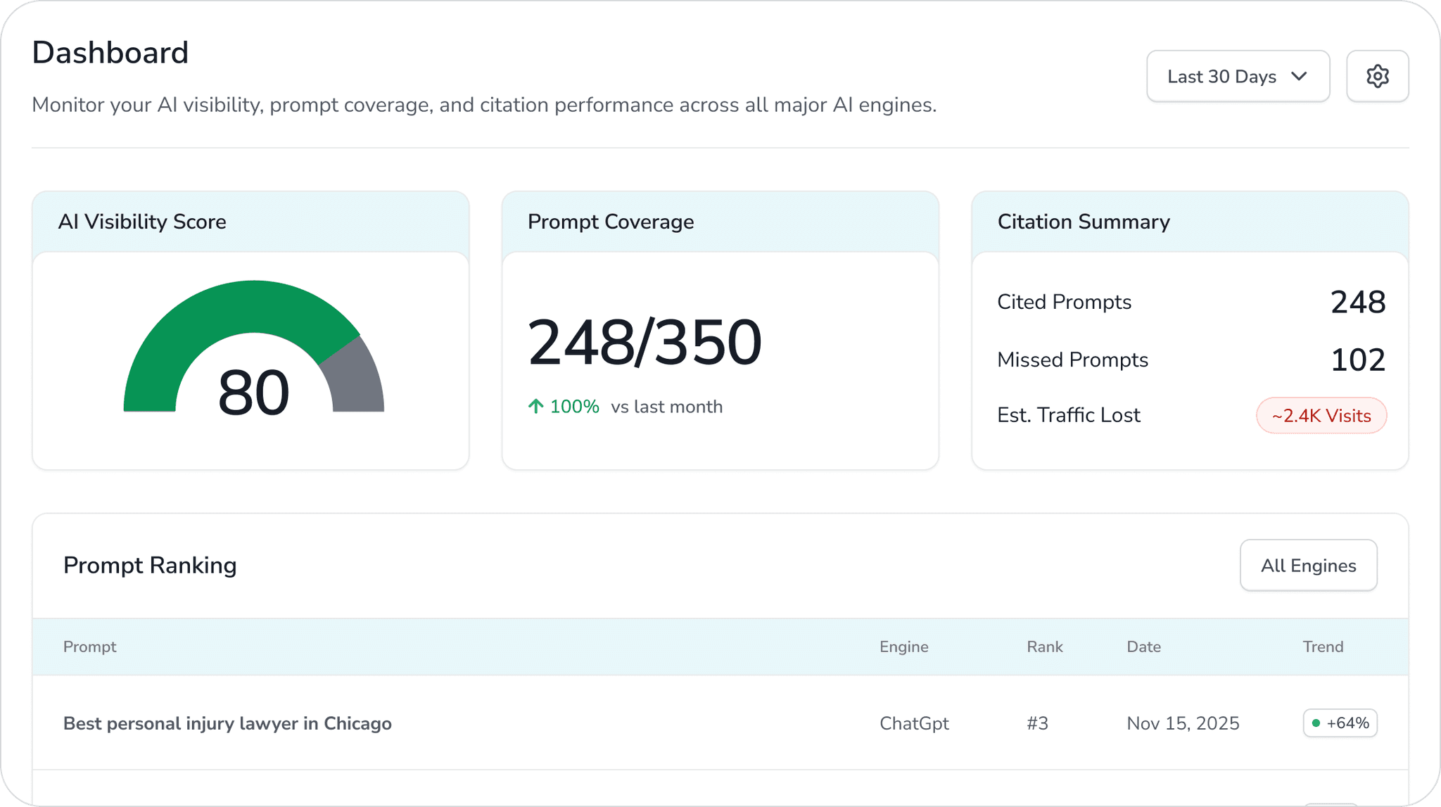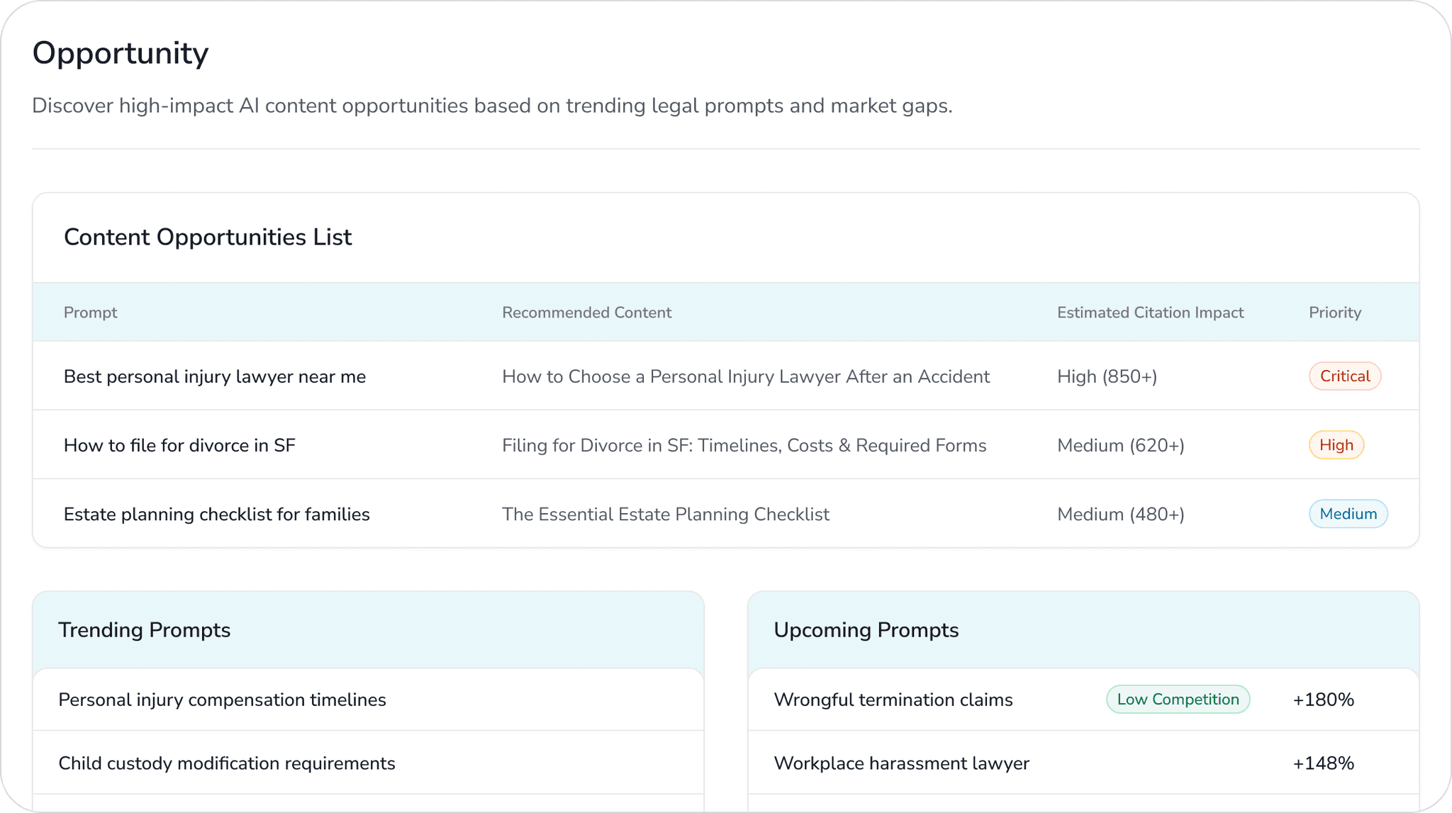We analyze 100,000+ high-intent legal prompts daily to show you precisely what clients ask, by city and practice area.